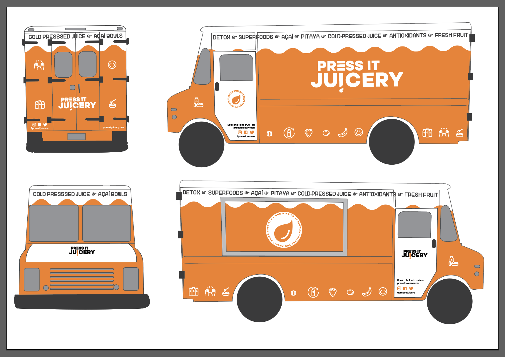 With all of these changes in the store bringing the monthly revenue to around $35,000, Josh wanted to expand the operations of the store to a juice (food) truck. This would allow the juicery to cater events, and increase it's presence in the local area. I was asked to create a design for a wrap.