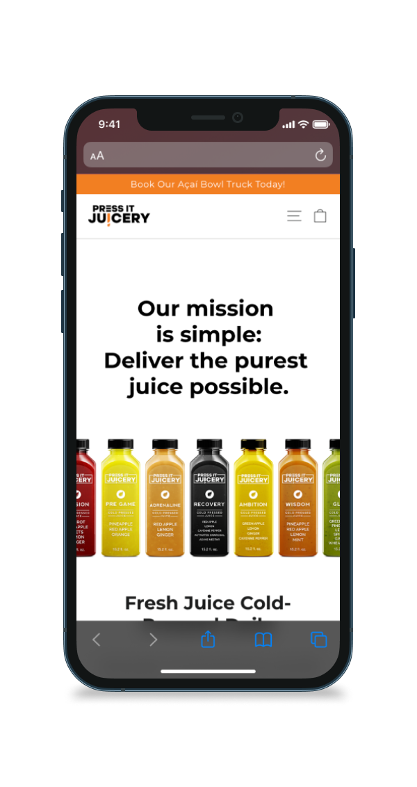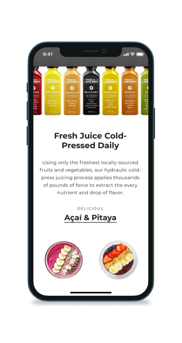Press It Juicery was running his online sales off of Shopify. The theme that was installed had ample functionality for a solid webstore. It just had to be restyled a bit. I noticed through my time working there that the customer base was mostly the health food crowd, not necessarily fitness enthusiasts. I thought that moving away from the original aesthetic would help Press It Juicery appeal to a broader, more on target audience. They had a cool slogan that I really liked: "Our mission is simple: deliver the purest juices possible." To stick with this theme of purity, and highlight the vibrant colors of the juices, I removed the gritty background elements, and replaced it with a simple minimalistic white.
